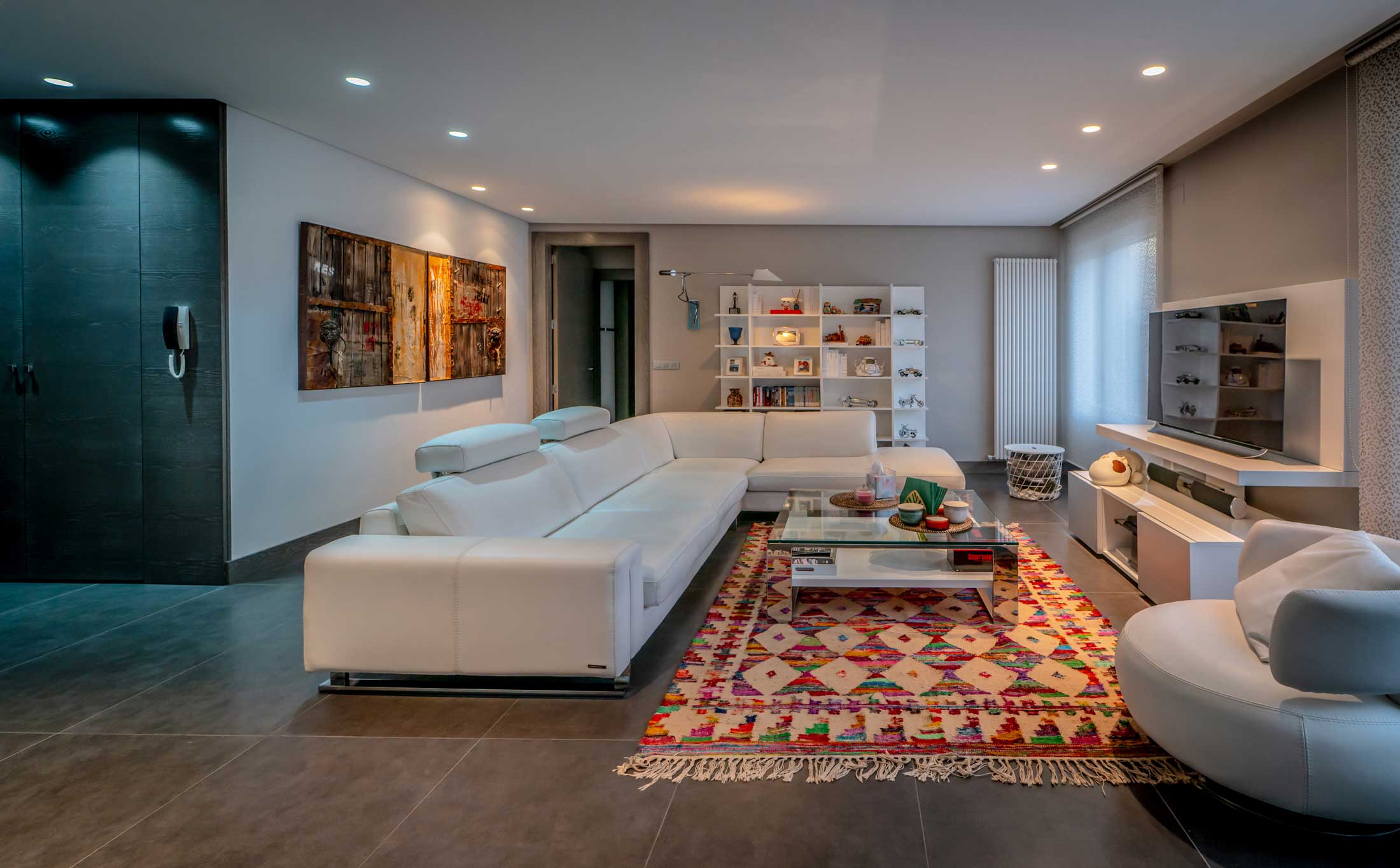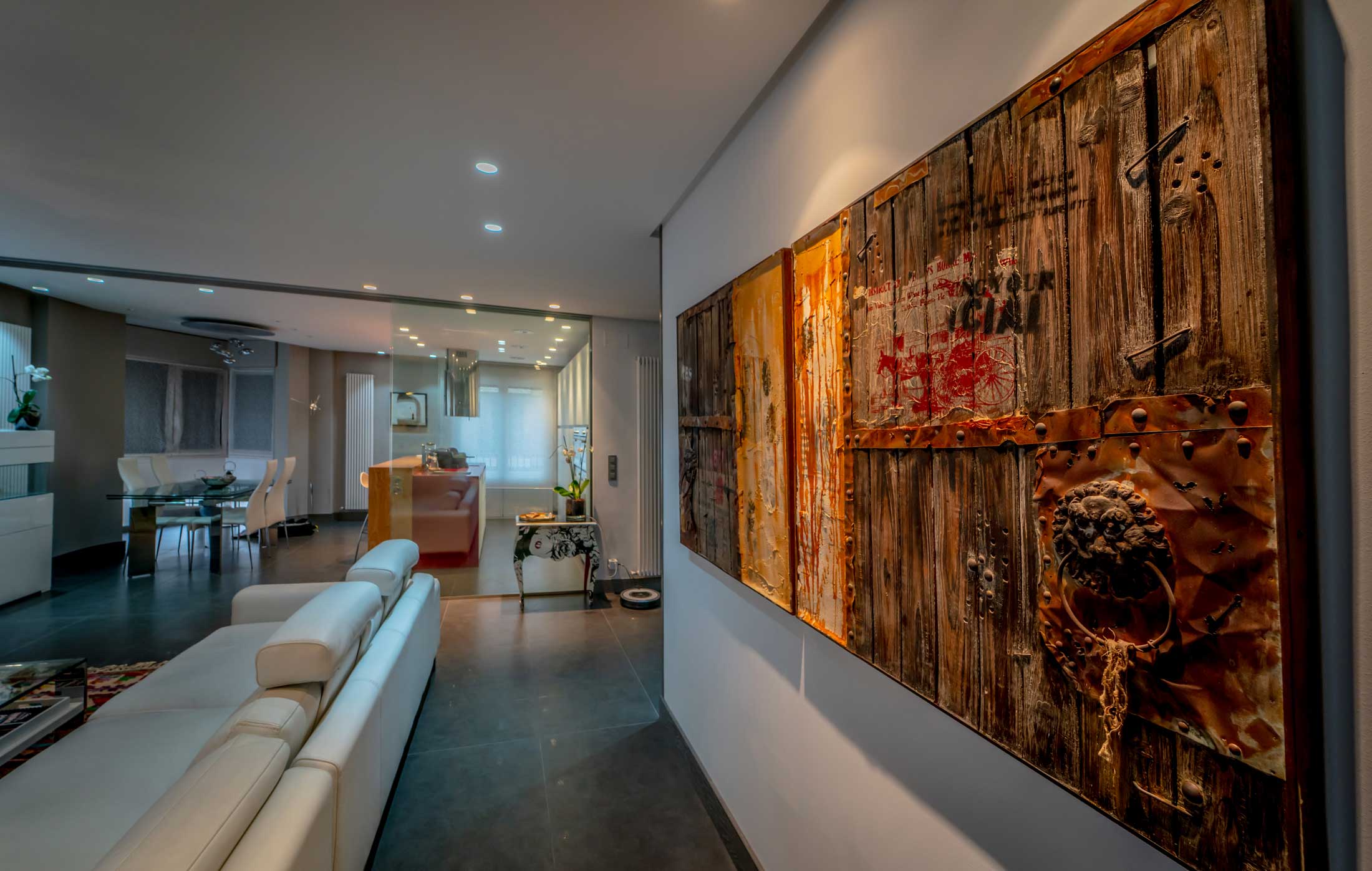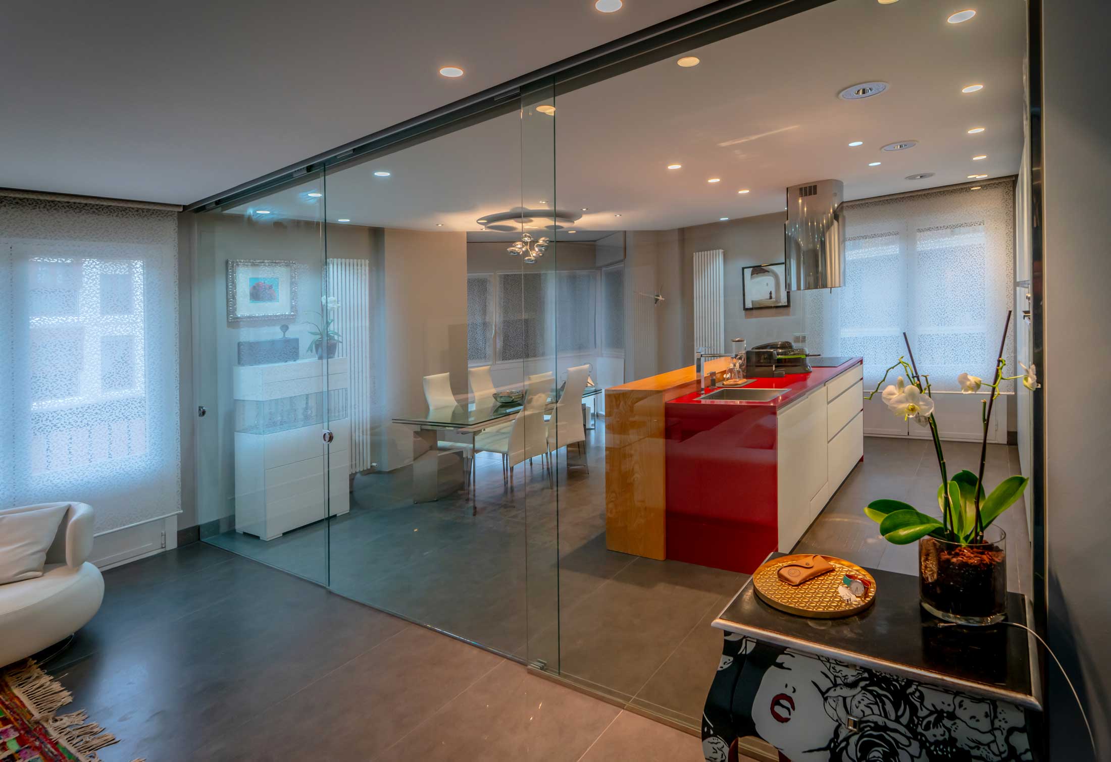 Esto incluye espacios versátiles según el uso en cada momento, como es el cerramiento en la zona de cocina mediante unas puertas correderas de vidrio que permiten abrir o cerrar el espacio.